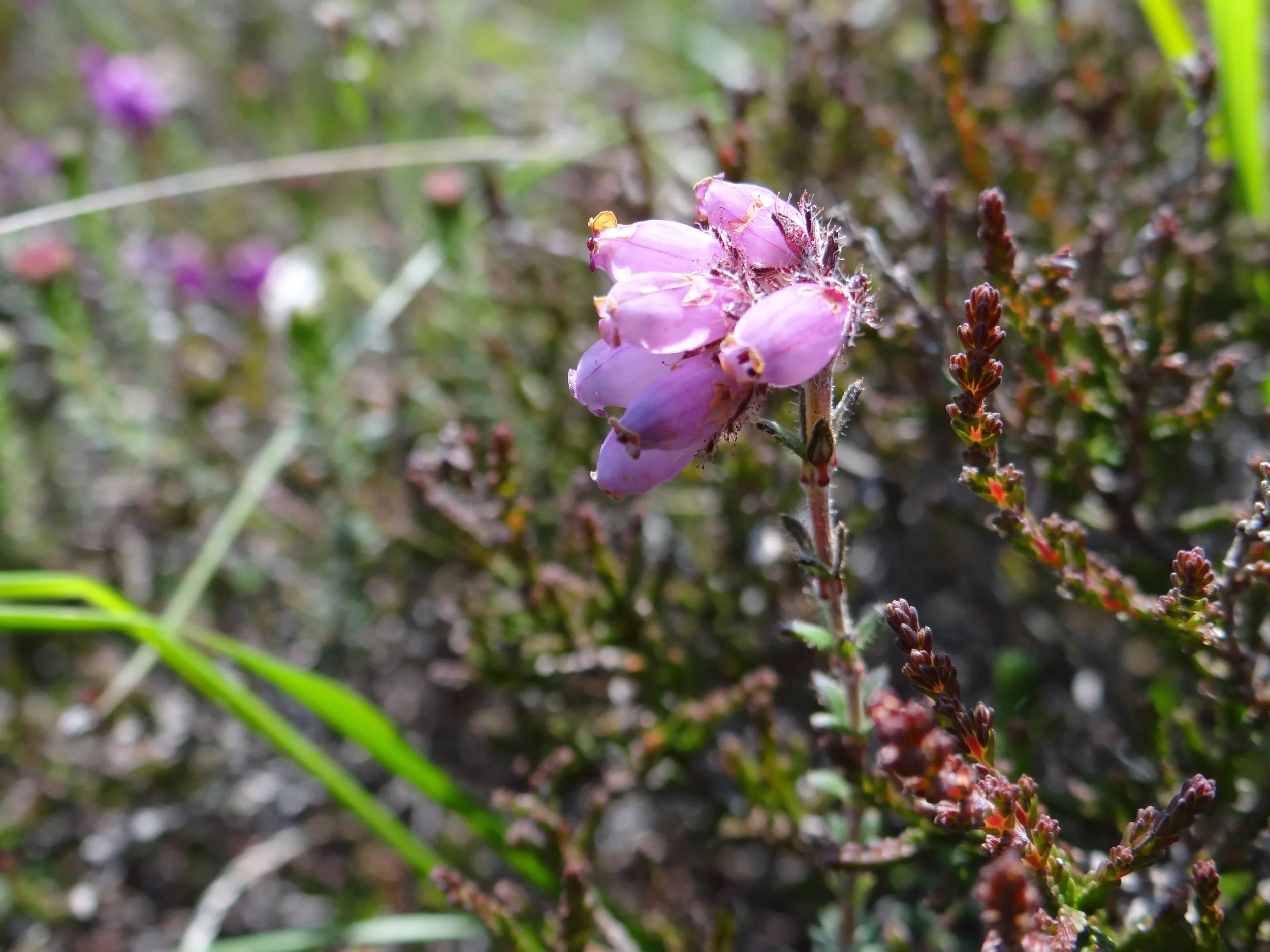 Cross-leaved Heath is easily recognised by its soft, grey-green leaves arranged in whorls of four and its clusters of pink, bell-shaped flowers, which sit on one side of their stems. Flowering from June to September, this species thrives in acidic, waterlogged soils.